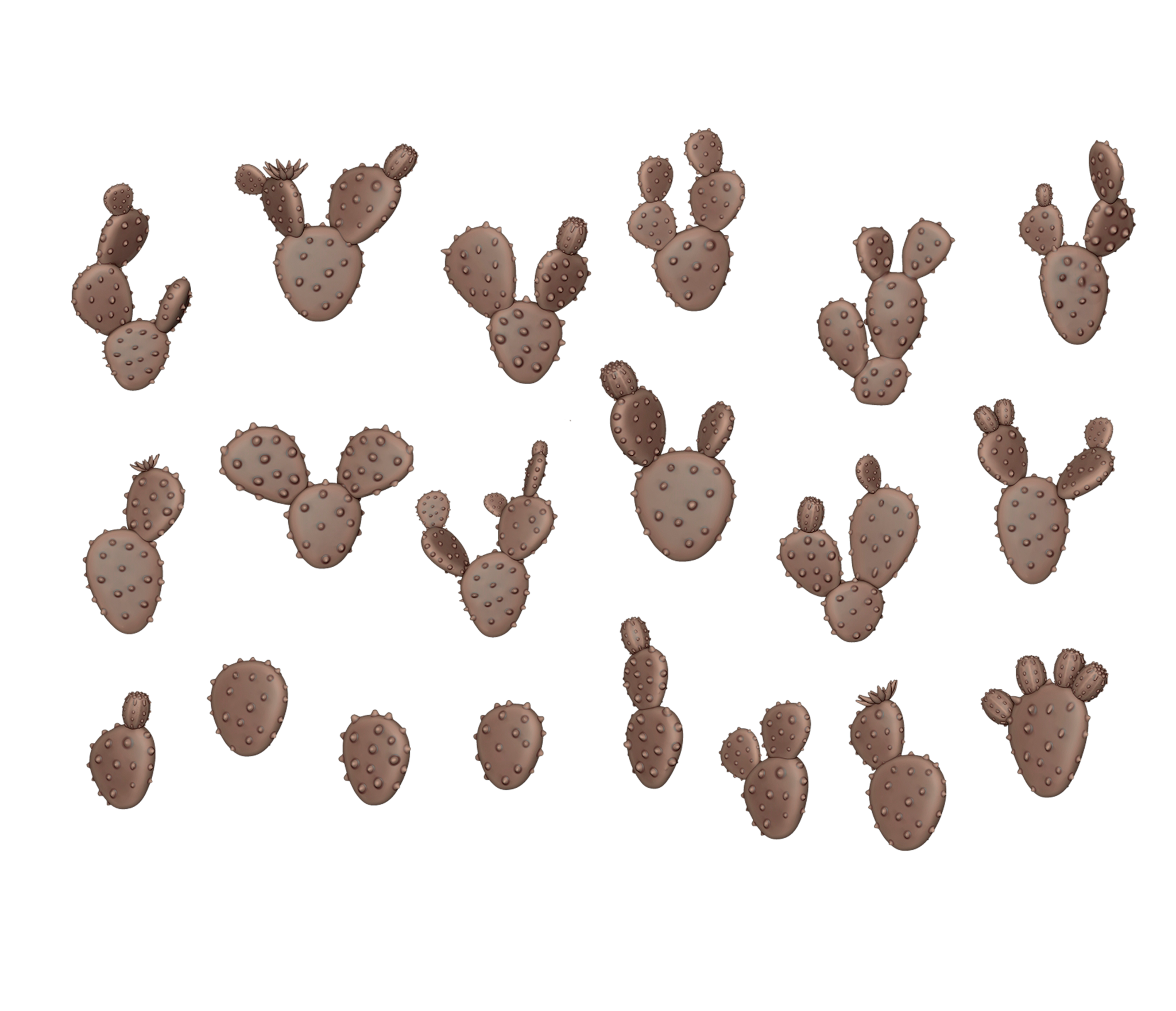 20 pieces. Cacti with fleshy, flat stems shaped like paddles, covered with spines and small stiff hairs. They can be used on bases to decorate desert-themed armies, such as orcs, and are also perfect for setting the scene in any arid environment.