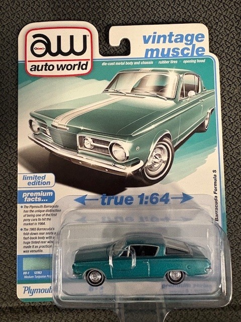AUTOWORLD - AW 07657A 1965 PLYMOUTH BARRACUDA FORMULA S MEDIUM TURQUOISE POLY 1/64 DIE-CAST