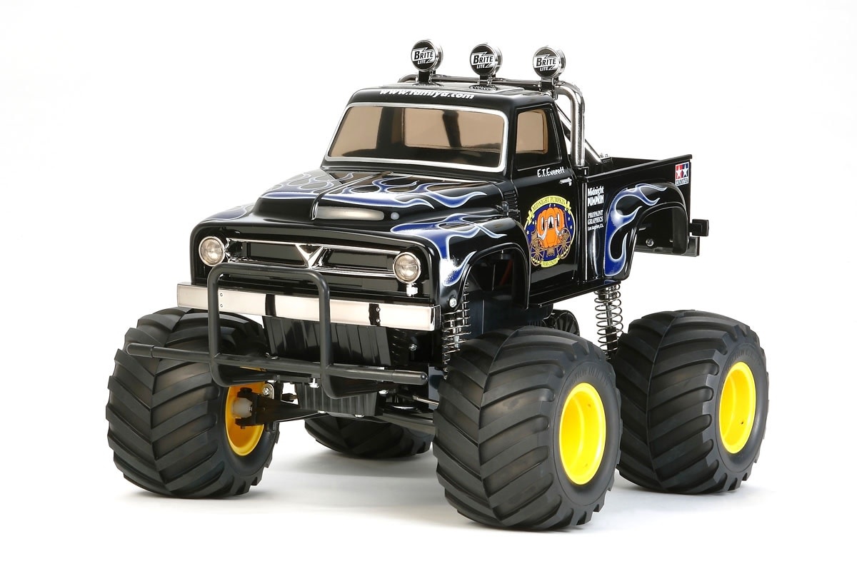 This 1/12 scale R/C assembly kit of the Midnight Pumpkin (first released in 1987) features a highly detailed pick-up truck body that is reminiscent of the classic 1950s American designs. The special “Black Edition” body comes molded in black and is accentuated by the metal plated front grille, overhanging fenders, dampers and roll bar. All this detail sits on top of big 115mm diameter tires.