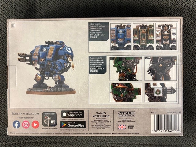 This box set contains one multi-part plastic Venerable Dreadnought. This 84-piece set includes: a plasma cannon, an assault cannon, lascannon, a heavy flamer, a storm bolter, two different power fists including an ornate one, and a set of smoke launchers. Also included are: two different sets of ornate leg guards, three different helmets, six purity seals, two different pennants, a range of different sarcophagus armour plates, several sarcophagus designs, and a host of Crux Terminatus and other Imperial icons.